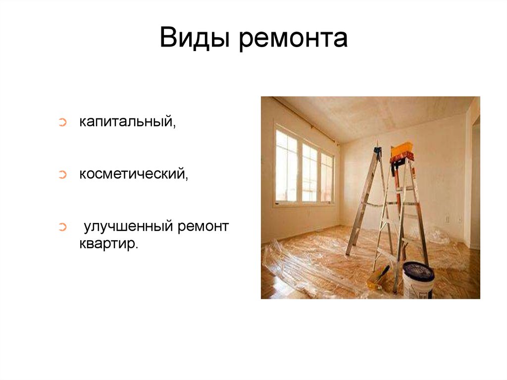 ΠΠΈΠ΄Ρ ΡΠ΅ΠΌΠΎΠ½ΡΠΎΠ² ΠΊΠ²Π°ΡΡΠΈΡ, ΠΊΠ°ΠΊ ΠΈΠ·Π²Π΅ΡΡΠ½ΠΎ, Π±ΡΠ²Π°ΡΡ ΡΠ°Π·Π½ΡΠ΅. Π§ΡΠΎΠ±Ρ Π½Π΅ ΠΏΡΡΠ°ΡΡΡΡ Π² ΠΎΠΏΡΠ΅Π΄Π΅Π»Π΅Π½ΠΈΡΡ , ΠΎΠ±ΡΡΡΠ½ΡΡ ΠΏΠΎΠ΄ΡΡΠ΄ΡΠΈΠΊΡ ΡΠ²ΠΎΠΈ Π½Π°ΠΌΠ΅ΡΠ΅Π½ΠΈΡ, Π²Π½Π°ΡΠ°Π»Π΅ Π½ΡΠΆΠ½ΠΎ ΠΎΠΏΡΠ΅Π΄Π΅Π»ΠΈΡΡ, ΠΊΠ°ΠΊΠΎΠΉ ΠΈΠΌΠ΅Π½Π½ΠΎ Π²ΠΈΠ΄ ΡΠ΅ΠΌΠΎΠ½ΡΠ° Π²Ρ Ρ ΠΎΡΠΈΡΠ΅ Π·Π°ΠΊΠ°Π·Π°ΡΡ β ΠΎΡ ΡΡΠΎΠ³ΠΎ Π±ΡΠ΄Π΅Ρ Π·Π°Π²ΠΈΡΠ΅ΡΡ Π΅Π³ΠΎ ΡΡΠΎΠΈΠΌΠΎΡΡΡ ΠΈ ΡΡΠΎΠ²Π΅Π½Ρ ΡΠΏΠ΅ΡΠΈΠ°Π»ΠΈΡΡΠΎΠ², ΠΊΠΎΡΠΎΡΡΡ ΠΏΠΎΡΡΠ΅Π±ΡΠ΅ΡΡΡ ΠΏΡΠΈΠ³Π»Π°ΡΠΈΡΡ Π΄Π»Ρ ΠΏΡΠΎΠ²Π΅Π΄Π΅Π½ΠΈΡ ΡΠ°Π±ΠΎΡ.