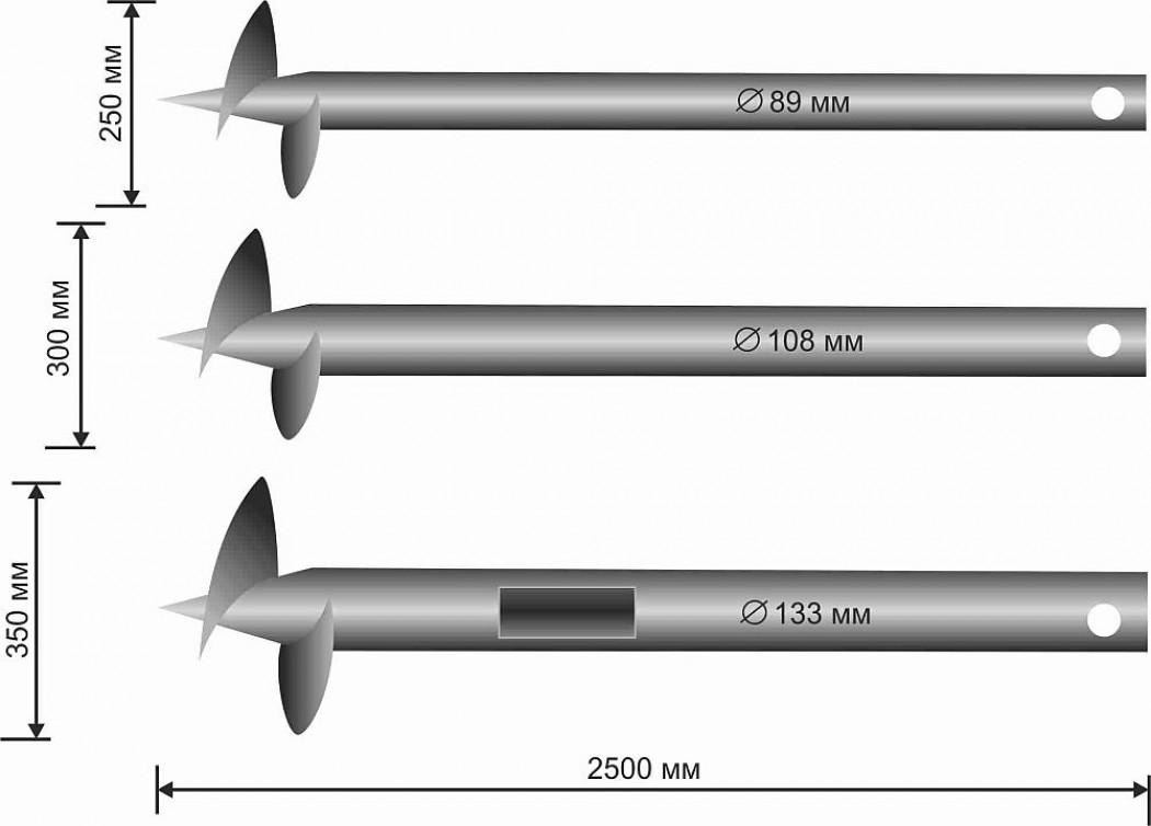 Самые тонкие сваи имеют диаметр 57 мм, они не предназначены для значительных нагрузок. Для строительства тяжелых домов требуются винтовые опоры диаметром 300 мм и более.