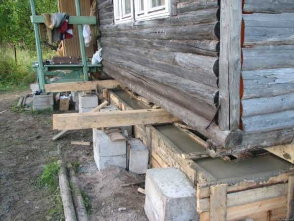 Фундамент из древесины, которую уже успел немного испортить грибок, обычно заменяют на ленточную или столбчатую конструкцию. Для этого постройку поднимают на определённый уровень и подставляют под неё бетонные блоки или кирпичи.
