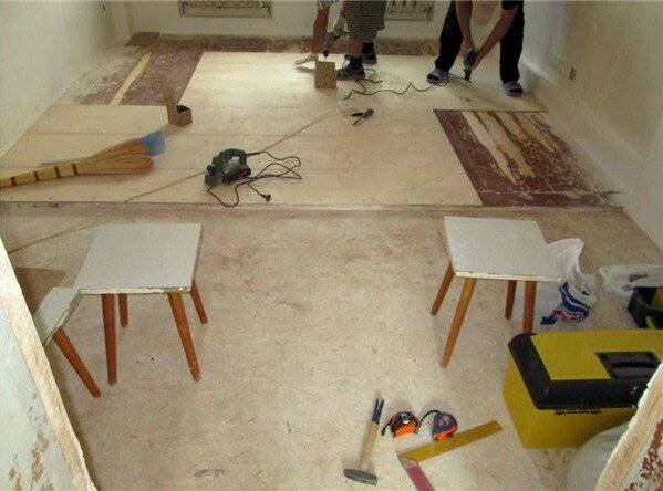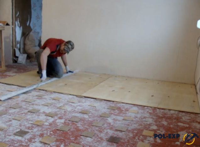 Бывает также, что старый пол приходится выравнивать в два слоя: сначала ДВП, затем фанеру. Обычно это связано с проблемами досок, которые приходится закрывать.