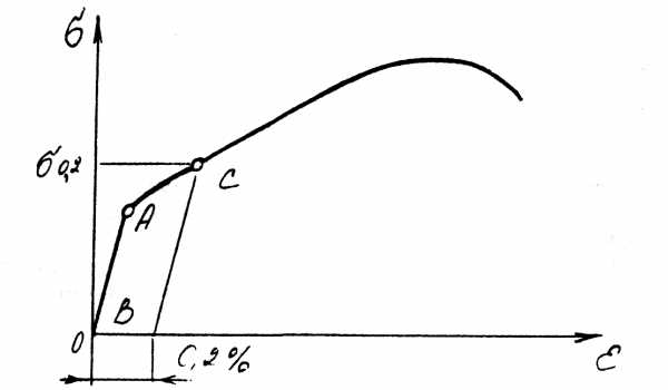 У многих конструкционных материалов площадка текучести не выражена столь явно, как у малоуглеродистых сталей. Для таких материалов вводится понятие условного предела текучести σs; это напряжение, которому соответствует остаточная (пластическая) деформация, равная s %. Обычно принимается s = 0,2%. Поэтому условный предел текучести часто обозначается как σ0,2.