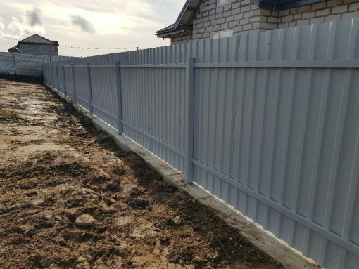 Забор из профлиста у частного домовладения прослужит долго, если правильно его установить. Существует много вариантов устройства такой ограды, которые в основном отличаются типом фундамента.
