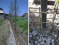- Вокруг столбов и по всей длине траншеи укладывают арматурный пояс, в углубления, где стоят столбы, заливают бетонным раствором.