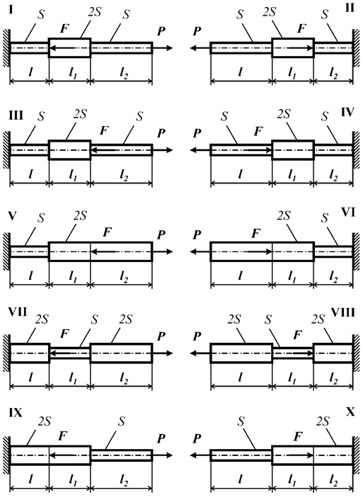 Общая длина бруса L (рис. 1). Одна часть бруса, длина которой l. имеет постоянную по длине площадь поперечного сечения F1 другая часть — постоянную площадь F2. На свободном торце действует сила Р1 в сечении, отстоящем от свободного конца бруса на расстоянии С действует сила Р2. На участке от точки на расстоянии l до точки на расстоянии от свободного конца действует равномерно распределенная продольная нагрузка t. Модуль упругости Е = 2105 МПа. F = 12104 м2, Р = 10 кН.