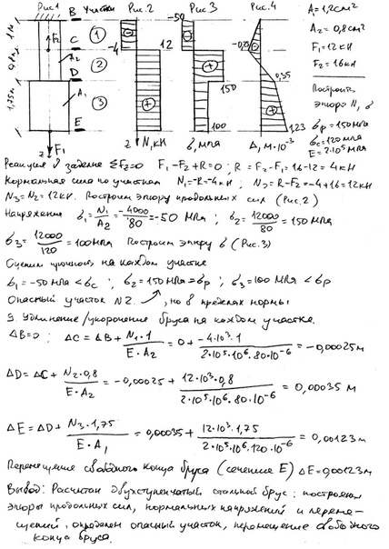 Самые простые задачи такого рода – на определение площади сечения стержня имеющего однородное или переменное сечение. Иногда просят найти перемещение какого либо сечения стержня или построение эпюры перемещений (относительных или абсолютных). Задача решается следующими образом: определяются реакции опор. Для статически определимой системы достаточно составления одного уравнения статики, если же система статически неопределима – дополнительно составляется уравнение деформаций . после определения реакций опор определяют величины внутренних усилий на участках стержня, строиться эпюра Nz , далее в общем виде определяется значения нормальных напряжений. Приравнивая эти выражения к допустимым параметрам материала, определяют размер сечения. Зная нормальные напряжения на участках стержня легко определить перемещение того или иного сечения.