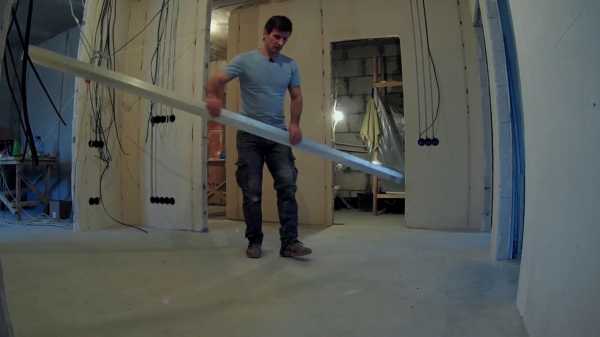 Устанавливаем в дверном проеме ограничитель – рейку, отрезок гипсокартона или профиля. Точно также поступим, если нет возможности выполнить заливку в один прием в слишком большом помещении или планируется устройство комбинированных полов. Приготовленную по всем правилам массу заливаем полосами, шириной не более 50 см.