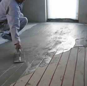 Если выполняется подготовка под напольное покрытие без утепления, то процесс укладки смеси заключается в простом выкладывании последней на плиту перекрытия и разравнивании её правилом.