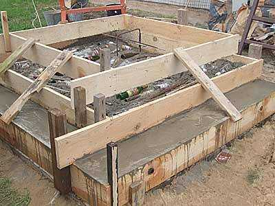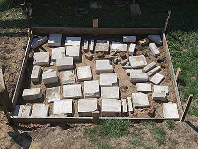 Приступаем к заполнению опалубки бетоном. Примерно в середине толщины плиты можно укладывать в бетон камни, стеклянные бутылки, отходы металла — это позволит немного сократить расход бетона и избавиться от несгораемого мусора.