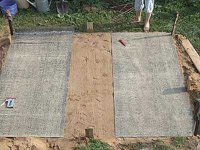 - Дно котлована следует хорошо утрамбовать и застелить геотекстилем или рубероидом. Затем сверху сделать подушку из 100 мм слоя песка 50 мм слоя щебня и все снова плотно утрамбовать.