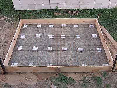 На рубероид укладываем готовые арматурные сетки-карты с ячейкой 100х100 мм (как показано на фото). Подкладывая небольшие обрезки газобетона.