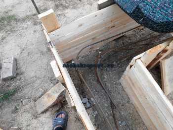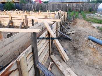 Прежде чем лить в траншеи готовый цементный раствор, надо установить опалубку — строительный короб из досок, шифера, фанеры, стекломагниевых листов или других материалов. Он необходим, чтобы формировать бетонную «ленту», а также не допускать пересыхания раствора, так как земля вытягивает часть влаги. В принципе, на глинистом плотном грунте допускается заливка фундамента без опалубки, но тогда нужно обязательно уложить по всему периметру траншеи полиэтиленовую пленку.