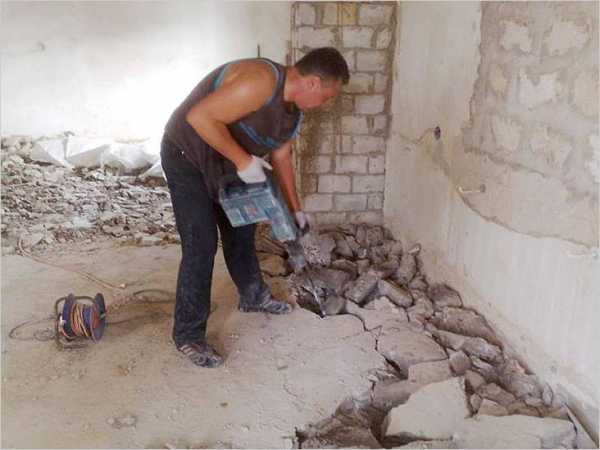 В начале всех работ необходимо демонтировать старые полы от покрытия до плит перекрытия – уберите доски, лаги, перфоратором аккуратно снимите верхний слой цемента, который накладывали на плиты перекрытия.