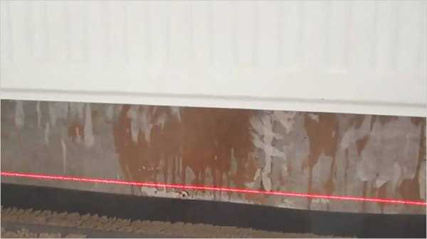 - Далее нам следует определить, какое получилось расстояние между этой линией и плоскостью пола. Более чем уверен, что при этом вы обнаружите несколько точек, размещенных ниже необходимого нам уровня. К примеру, минимальное расстояние в одной из точек будет равняться девяноста пяти сантиметрам, а норма наша, еще раз напомним, один метр. Нам же нужно отметить как самые низкие, так и самые высокие точки.