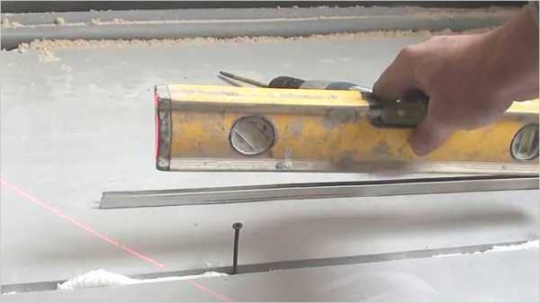 - Далее сверлим по линии под леской в полу ряд отверстий с шагом 100-180 см. Если вы делаете работу своими руками, то шаг может быть 50-60 см. Опытные мастера могут сделать шаг по длине правила. В отверстия ввинчиваем саморезы на дюбелях. Эти маяки тоже нужно выставить по горизонту (леске).