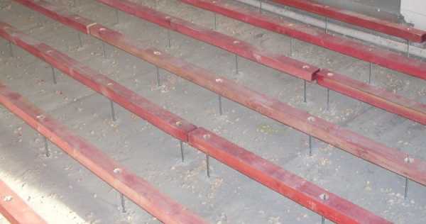 - Стяжка, обустраиваемая поверх деревянной основы, должна быть неподвижной, что достигается за счёт её значительной массы. Необходимо учитывать, что толщина бетонного слоя должна быть не менее 3 см.