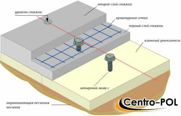 - Через сутки, когда смесь затвердеет, маячные кучи покрывают грунтовкой и начинают укладку стяжки.