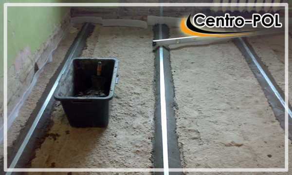 - Сначала нужно сделать растворные грядки на основании. При этом укладку раствора ведут поверх изоляционного материала, стараясь не повредить его. Сверху на гряду укладываются профили для гипсокартона, рейки, куски труб, Т-образные профили для выравнивания штукатурных стен или доски.