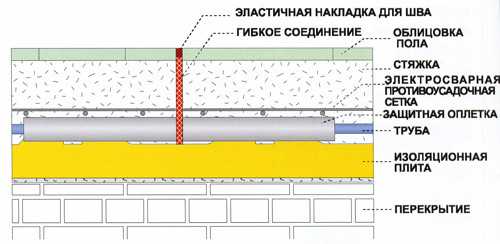 Швы протягивают в слое бетона по периметру. Трубы, находящиеся на пересечении деформационных швов, необходимо защитить с помощью гильз из жесткого пластика или металла и залить только потом.