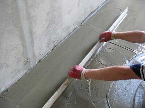 После приготовления цементный раствор приносят в ведрах и постепенно заполняют пространство между маяками. Для разравнивания и придания гладкости применяют разглаживающее правило. То есть, заполнив пространство между маяками на нужную высоту, правилом разглаживают раствор до достижения заданной гладкости. Незначительные неровности затирают пластиковой теркой. Заполнение цементным раствором пространства желательно начинать с дальнего угла или стены от входа в помещение.