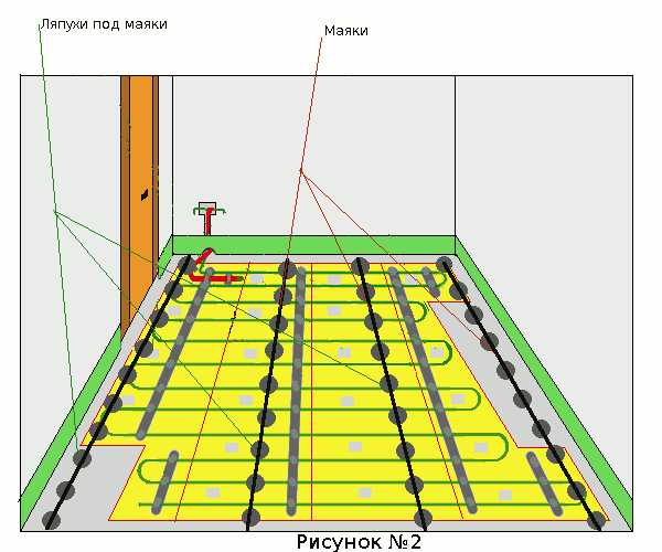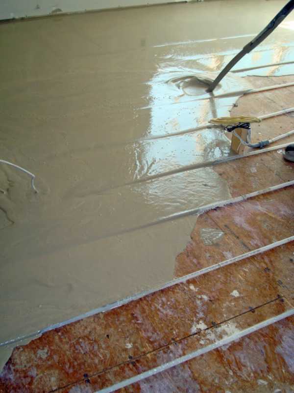 Схема заливки бетонного теплого пола на основание из фанеры.