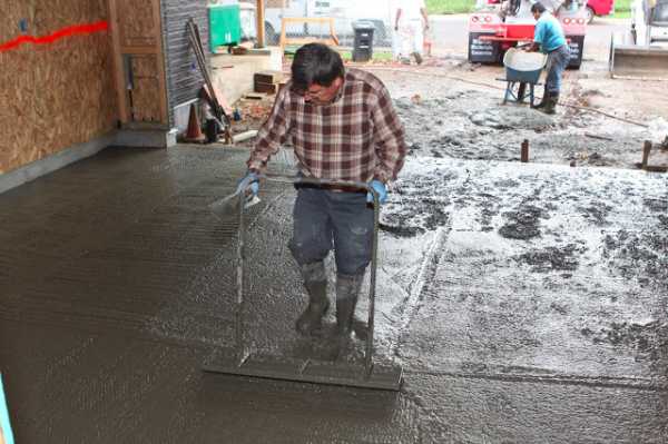 Налитый на пол бетон тщательно разравнивают длинным правилом. При использовании такой технологии покрытие в конечном итоге получается максимально ровным и аккуратным.