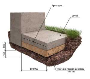 Бывает мелкозаглубленного типа, для легких зданий. А под тяжелые бетонные строения выполняется заглубленный фундамент, который фиксируется на 20-30 см ниже отметки промерзания слоя земли.