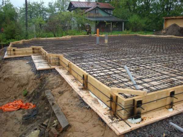 Правильная заливка данного фундамента под дом начинается с рытья сплошного котлована глубиной до 60 см. На дно укладывается высотой 25 см песчаная подушка и 15 см щебень. Затем, выстилают гидроизоляционный материал и делают двухслойный каркас из арматуры диаметром 10-12 мм и ячейками 20*20 см в виде сетки. Все это увязывают и заливают бетоном.