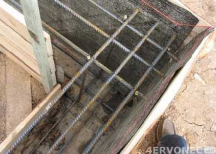 Шаг третий. Внутрь заливочного русла помещается арматура. Наиболее распространена для этих целей армированная сетка, расходы на нее обычно включат в смету. Также используется железный прут. Оптимальная толщина прутковых элементов 8-12 мм. В частном строительстве нередко применяют любые металлические предметы длинной, плоской формы (обрезки металлических труб, фрагменты старых железных кроватей).