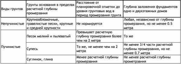 Они непосредственно влияют на глубину заливки, выбор типа и особенностей проведения работ по строительству. Так на пучинистых грунтах (песок, суглинки) глубина прокладывания траншеи меньше расстояния промерзания верхнего слоя земли. Непучинистые (скальные или полускальные породы) и слабопучинистые (крупные или средние гравейные пески, крупнообломочные грунты) — служат надежным основанием для будущей постройки и не требуют сильного углубления. Они меньше всего реагируют на сезонные перепады температур и движение почвы.