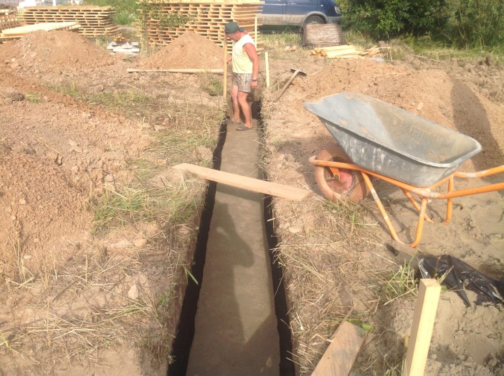 Без них также не обойдётся ни одно строительство фундаментного основания. Следует грамотно обустроить траншею, которая будет соответствовать ширине фундамента. Важно внимательно следить за тем, чтобы стены траншеи были строго ровно-вертикальные. Глубина получившейся траншеи должна преодолевать уровень промерзания грунта. - Для обеспечения ровной усадки основания требуется обеспечить песчаную подушку, которая располагается на дне траншеи. Толщина песчаного слоя обычно находится в диапазоне от пятнадцати до двадцати сантиметров. Далее необходимо оборудовать гидроизоляционный слой. В качестве материала для этой цели может использоваться и обыкновенная полиэтиленовая плёнка.