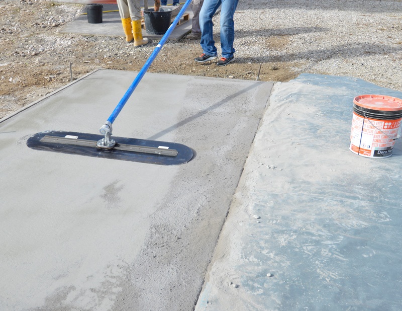 Верхний слой бетона (3мм) состоит цемента, песка и воды. Пока эта часть пластична, ни жидкая, ни твёрдая, её можно утрамбовать и отшлифовать. На этом этапе будет видно на сколько хорошо были выполнены подготовительные работы: если вы правильно уложили и выровняли бетон, завершающая отделка будет продвигаться быстро.
