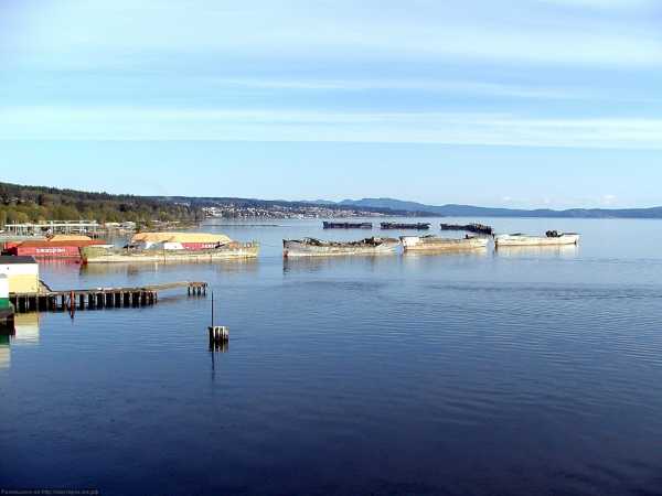 Мол, созданный из бетонных судов на Пауэлл-Ривер, Британская Колумбия.
