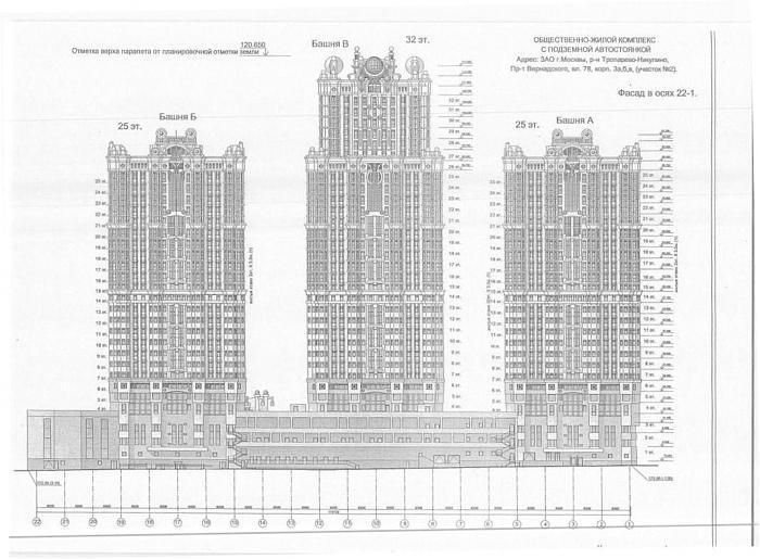 На едином трёхэтажном стилобате размещаются три монолитные башни – две 25-этажных и одна 32-этажная. Расположены они таким образом, чтобы из окон одного корпуса не просматривались окна другого: важный момент, создающий ощущение приватности.