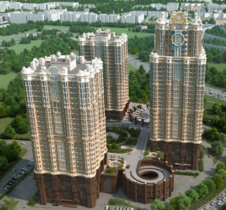 Это башни, отделанные светлым камнем с тёмным коричнево-бордовым стилобатом, эркерами и большим количеством декоративных украшений. Смотрятся они статусно, но, пожалуй, несколько тяжеловесно. В любом случае, со времени создания проекта прошло столько лет, что сегодня актуальность его внешнего облика чуть потускнела.О квартирах: размах и комфорт