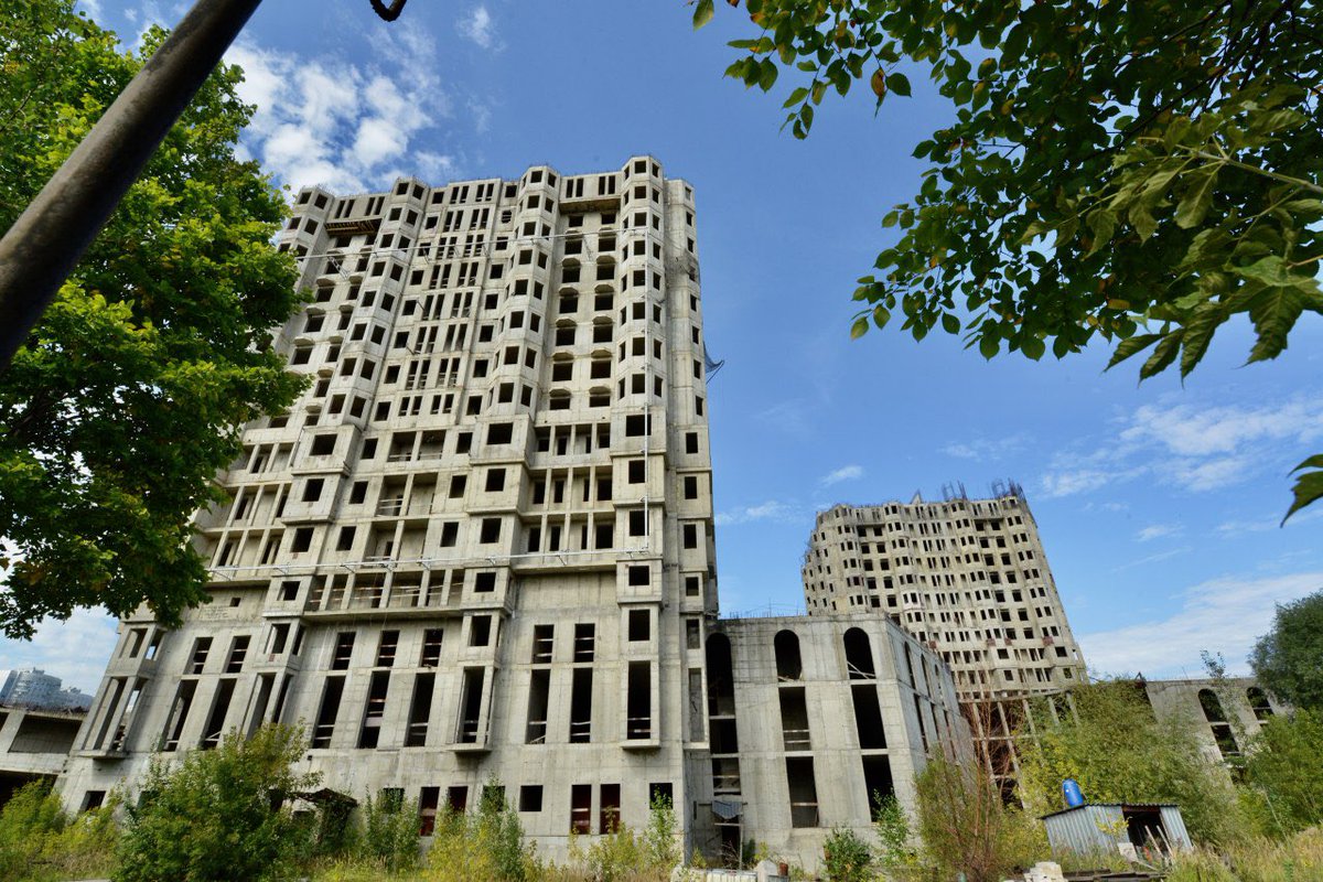 В далёком 2005 году началось возведение ЖК бизнес-класса «Академ Палас». Он должен был стать настоящей доминантой городского района Проспект Вернадского: и внешний вид и наполнение проекта отсылали к фантастическим городам будущего. Но победила проза жизни: застройщик «Объединённая строительная компания» не смог выполнить своих обещаний, и его дольщики, вот уже почти 15 лет, ждут своих квартир.«Академ Палас» был задуман с размахом, это отражено даже в названии. Настоящий современный дворец с замысловатой архитектурой, просторными квартирами и кучей технологичных решений и интересных фишек, на рендерах он смотрится более чем внушительно. Но рендерам уже гораздо больше десятилетия, а то, что можно увидеть в реальности выглядит удручающе.