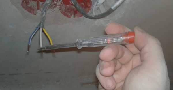 Оставшиеся провода могут быть любого цвета – красного, черного, белого, при этом необязательно цвет провода будет соответствовать «фазе» или «нулю». Для точного определения где какой провод концы необходимо прозвонить специальным тестером или индикаторной отверткой – приспособление со встроенным светодиодом, показывающее наличие напряжения. Проверка проводится с включенной сетью и положением настенного выключателя «ВКЛ». Поочередно касаемся оголенных концов проводов и смотрим результат. Фаза будет светиться лампочкой на индикаторной отвертке, а мультиметр покажет значение напряжения 220 В. Нужно отметить, что тестер будет показывать напряжение только между нулем и фазой. Для выключателя с одной клавишей еще проще – два провода на потолке, из них один ноль, а второй это фаза. Перед на чалом работ по подключению светильника обязательно нужно обесточить провода, желательно сделать это выключением рубильника на счетчике.