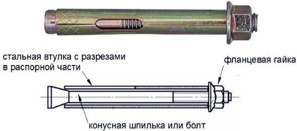 Для решения ответственных задач применяют распорные анкера для бетона с гайками, где работает сила трения. Они представляют собой шпильку с резьбой, коническим наконечником и втулкой. При вкручивании она расклинивается и прочно удерживает болт в теле бетона.