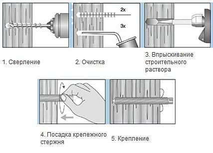 - за счет специального клеевого состава, связывающего болт и внутренние стенки отверстия (химический анкер).