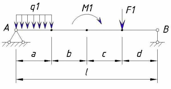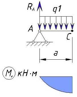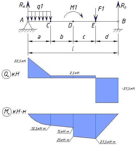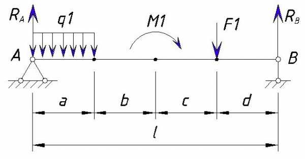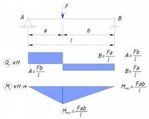 Из эпюры балки нам необходимо будет вычислить максимальный изгибающий момент, поперечную силу, опорные реакции стержня. Эти данные нам понадобятся для подбора сечения и проверочного расчета элемента конструкции.