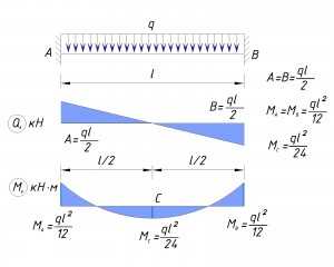 При защемлении в узлах максимальный момент в балке в 2-а раза ниже, чем в балке с равномерно-распределённой, однако необходимо сделать жесткий узел с колонной, что создает некоторые сложности. Кроме того момент от балки будет передаваться на колонны, как и момент с колонн будет передаваться на балку.