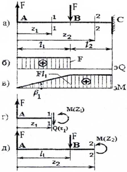 II силовой участок (BC): l1 ≥ z2 ≥ (l1+ l2) (рис. 4, а, д)