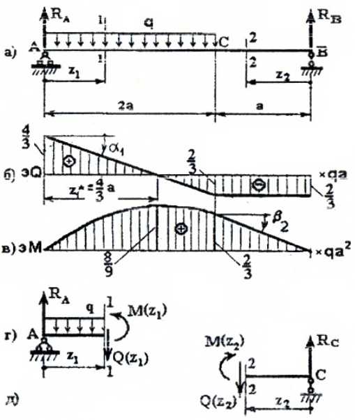 Построив эпюры Q и M по всей длине балки (рис. 4 а, б, в), видим, что на первом участке — деформация прямого поперечного изгиба, т.к. Q≠0, M≠0; а на втором – прямого чистого изгиба.