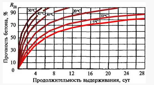 Набор прочности представляет собой химический процесс, требующий оптимальных условий, наиболее важны тепло и влажность. В зависимости от соотношения этих показателей, процесс достижения нормативных прочностных характеристик длится до 28 суток.