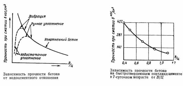 Снижение температуры сильно замедляет твердение бетона, если не применять специальные добавки. Повышение температуры резко ускоряет твердение бетона, но следут не допускать высыхания бетона. Если бетон греть водяным паром при температуре 80oС в течение 16 часов, то бетон наберет 60-70% марочной прочности (заводская пропарка — изготовление свай и т.д.)