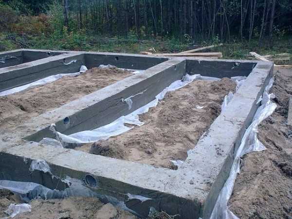 - Если все-таки есть необходимость оставить фундамент зимовать, необходимо его «законсервировать» — закрыть и защитить от атмосферных осадков, исключить замокания и затопление грунта вблизи фундамента (примерно 0,4…0,5 м).