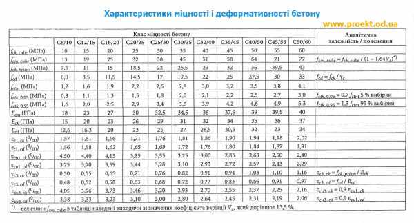 Согласно определению, бетоном называется искусственный камень, получаемый в результате затвердения бетонной массы, состоящий из смеси цемента, заполнителей разной крупности (щебень, песок) и воды. Прочность бетона на сжатие является одной из важнейших характеристик бетона. Ранее о прочности бетона судили по его марке (марка обозначается буквой М с цифрой, указывающей на среднее арифметическое значение прочности образцов на сжатие в кгс/см2). В строительстве применяются следующие марки бетона: М50, М75, М100, М150, М200, М250, М350, М400, М450, М550, М600, М6ОО, М700, М800. Однако, сегодня основным показателем прочности бетона является его класс. Класс бетона обозначается буквой С. Существуют следующие классы: C8/10, С12/15, С16/20, С20/25, С25/30, С30/35, С32/40, С35/45, С40/50, С45/55, С50/60. Ниже в таблице приведены соотношения между классом и марками бетона по прочности:Класс бетона по прочности (С) по ДБН | Класс бетона по прочности (B) по СНиП | Ближайшая марка бетона по прочности М, кгс/см. кв. |