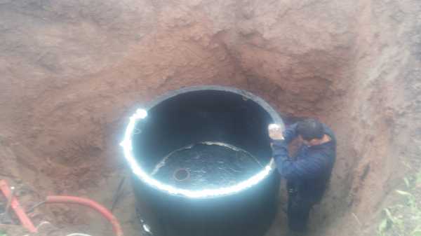 К тому времени пока мы доставали кольца, к нам подоспели новые кольца. После того как достали старые, необходимо было углубить котлован и сделать ровную песчаную подушку. Как подушка была готова, пришло время выстраивать бетонный кессон. Перед установкой необходимо было пробурить отверстие в плите днище под скважинную трубу. После чего днище было опущено на дно и сверху установили кольца друг за другом. Кессон у нас был из 1,5 м жб колец. Предварительно лично каждое кольцо промазал битумной мастикой (марка 24, говорят она лучше герметизирует) двумя слоями после подсыхания предыдущего. Не смотря на шедший весь день дождь, мастика сохла хорошо.
