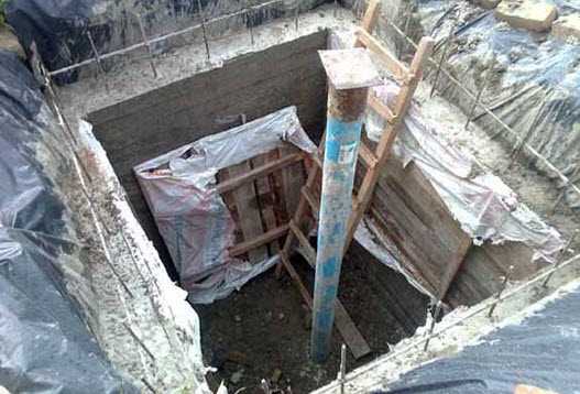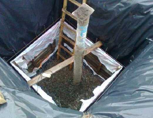 Процедура возведения кладки или установки опалубки может быть начата после того, как залита опорная плита или ленточный фундамент, оборудуемый, в свою очередь, после того как будет выполнен приямок для скважины, который можно вырыть своими руками или привлечь средства малой механизации.