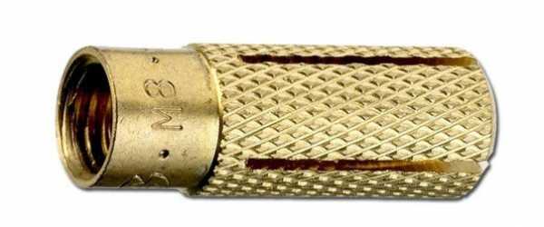 Вторым по значимости элементом конструкции анкера является втулка, на боковой поверхности которой выполнены продольные прорези, формирующие своеобразные лепестки. Такая втулка, надетая на шпильку, не закрывает только ее верхнюю часть, на которой размещена гайка изделия.