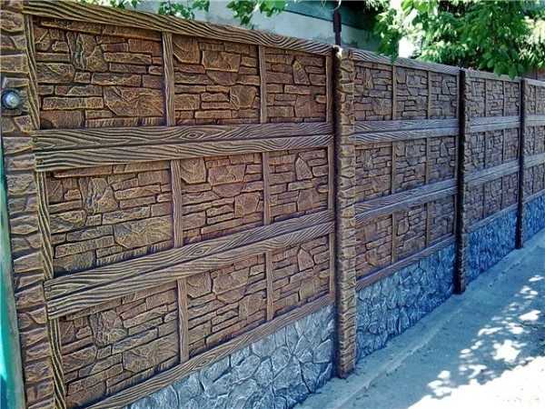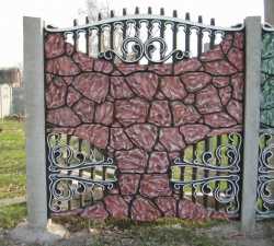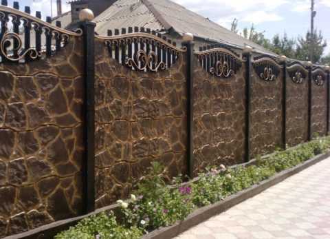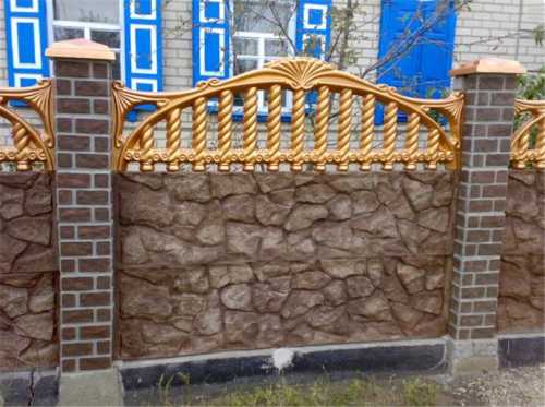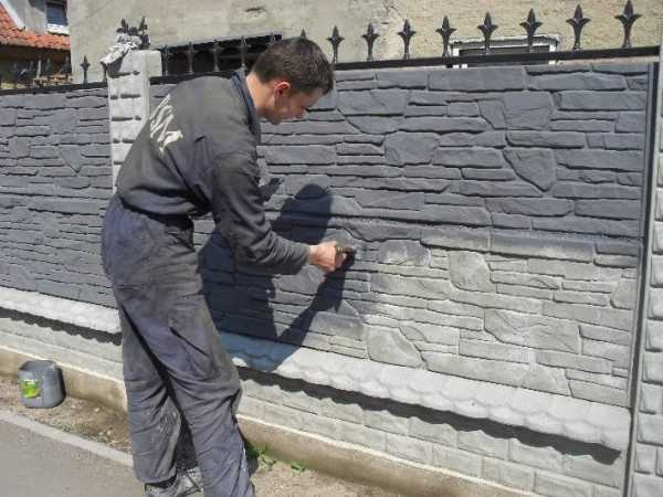 Красим бетонные заборы с имитацией под каменьКамень бывает разных оттенков, поэтому даже в этом вопросе отсутствуют ограничения. При желании можно выбрать темно-желтый песчаник или черный гранит, главное, не отходить от основной линии и продолжать ее, создавая вторую половину. В этом случае забор станет естественным и ярким.